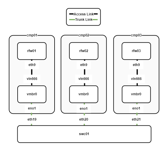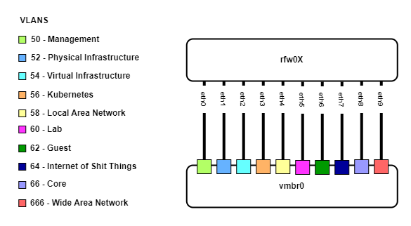 - Three VyOS VMs (rfw01-03) have 10 interfaces, one for each VLAN.