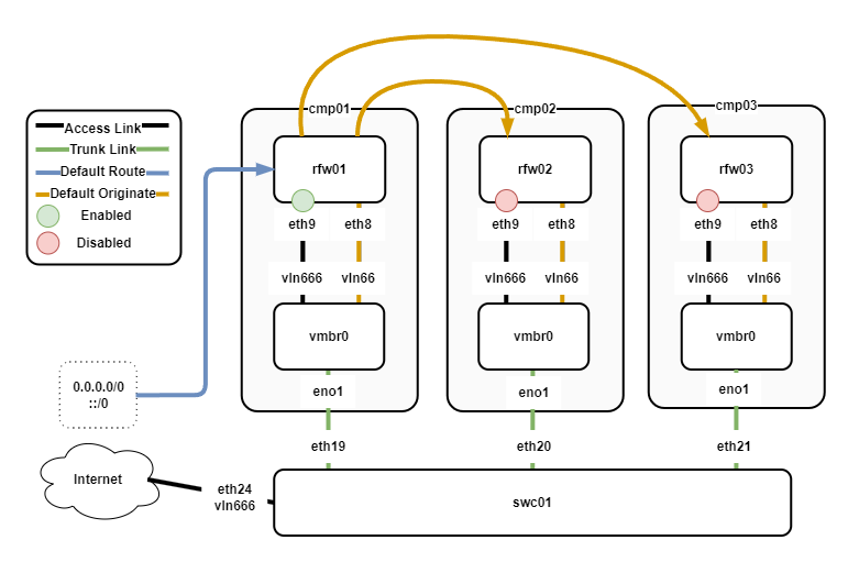 - rfw01 is the active router and rfw02/03 backup routers.