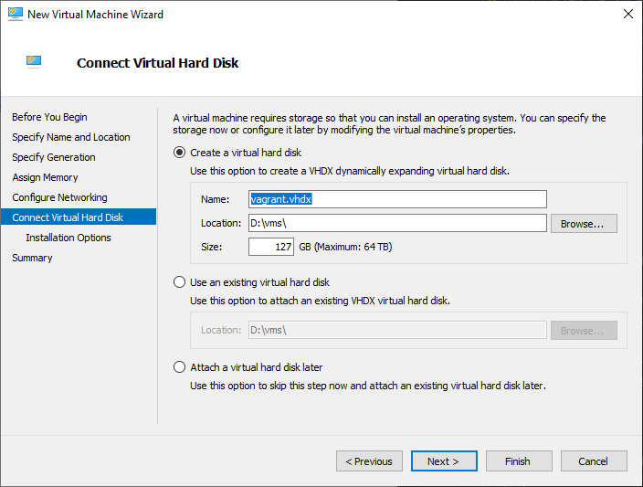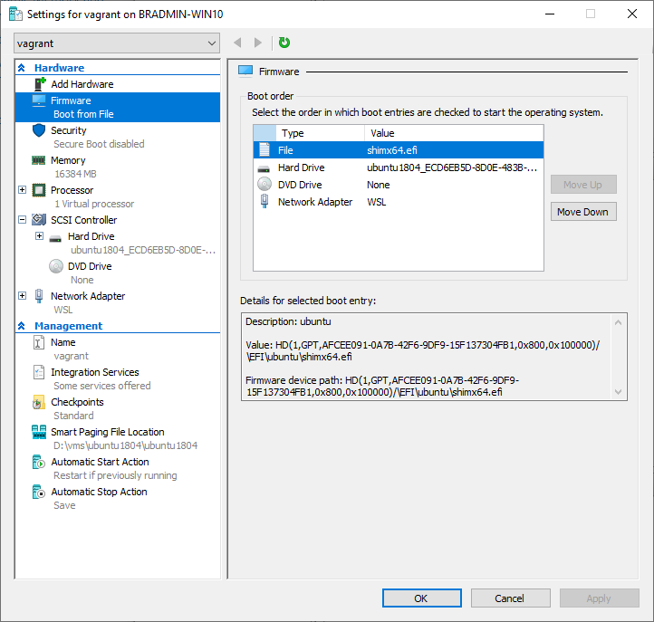 Readers of my blog will probably have noticed that I like to use Vagrant for development and testing. I recently switched to using Windows and found the Hyper-V provider for Vagrant to be a bit limited. In this post I will install an Ubuntu 1804 VM on Hyper-V for use as a Vagrant server so that I can maintain my usual development/testing workflow.