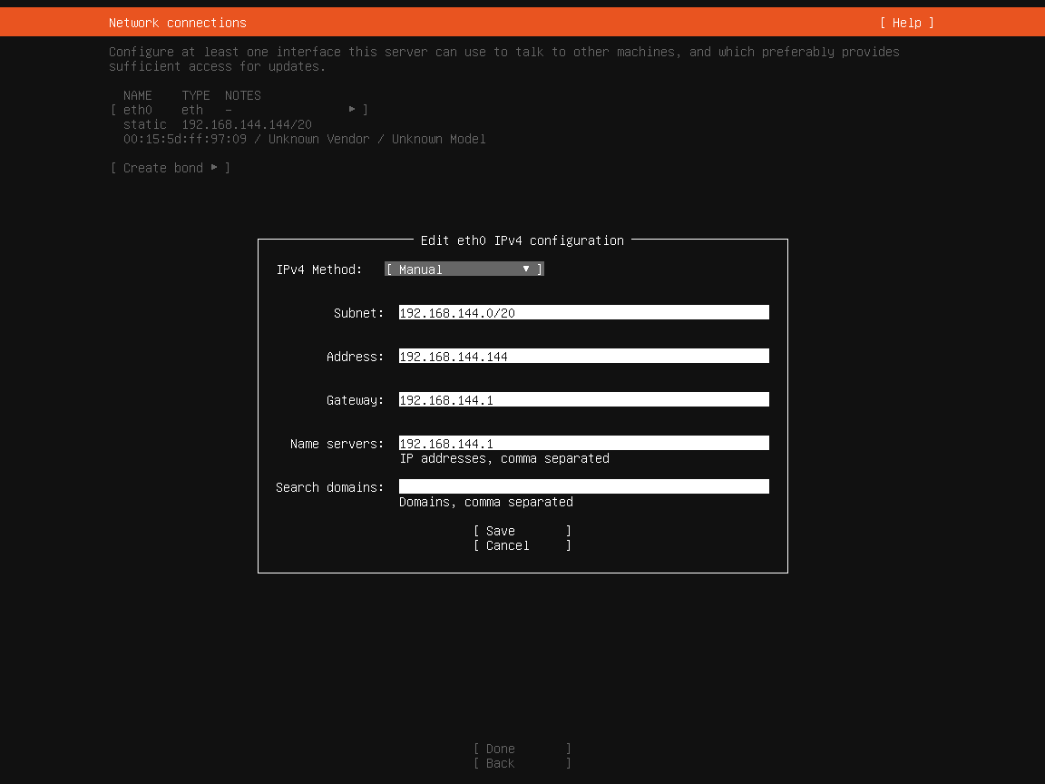 I wont cover the whole installation process as it is pretty straight forward. When you get to the network connections section set a static IP according to your LAN settings. The below screen shot is an example.
