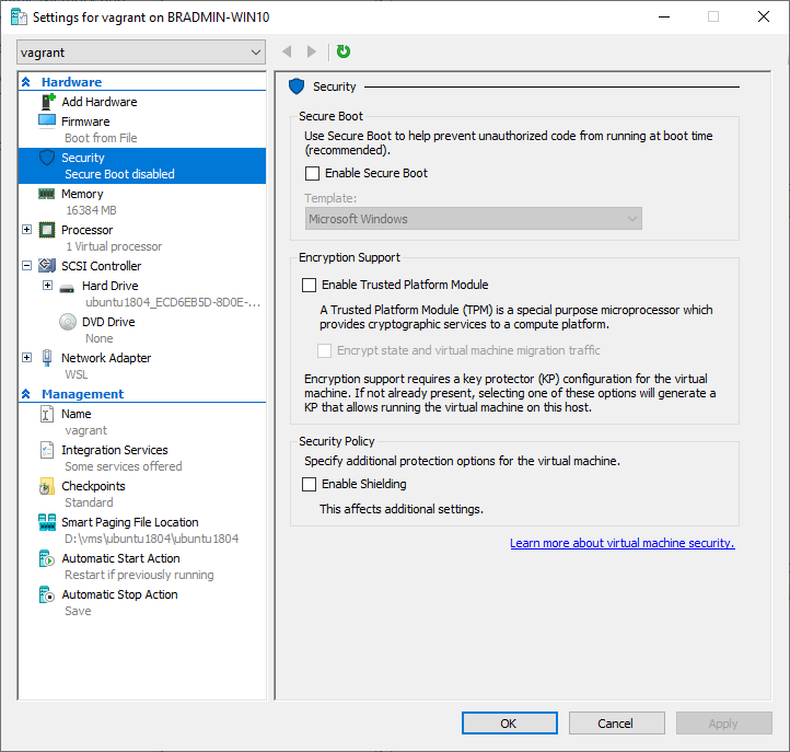 OK, with that step completed we have an Ubuntu 1804 VM installed on Hyper-V. Next up we need to enable nested virtualization.