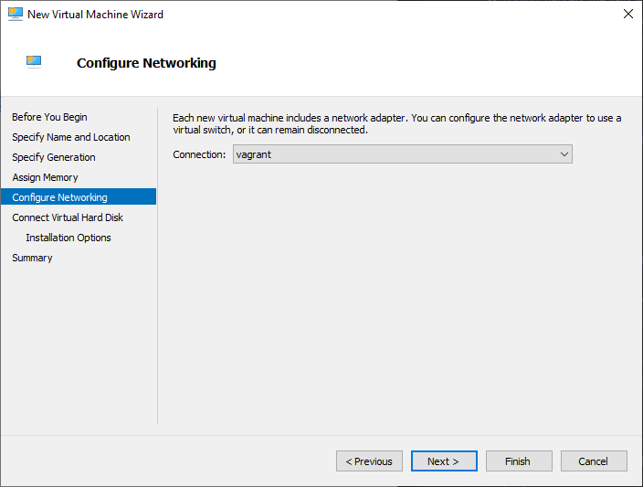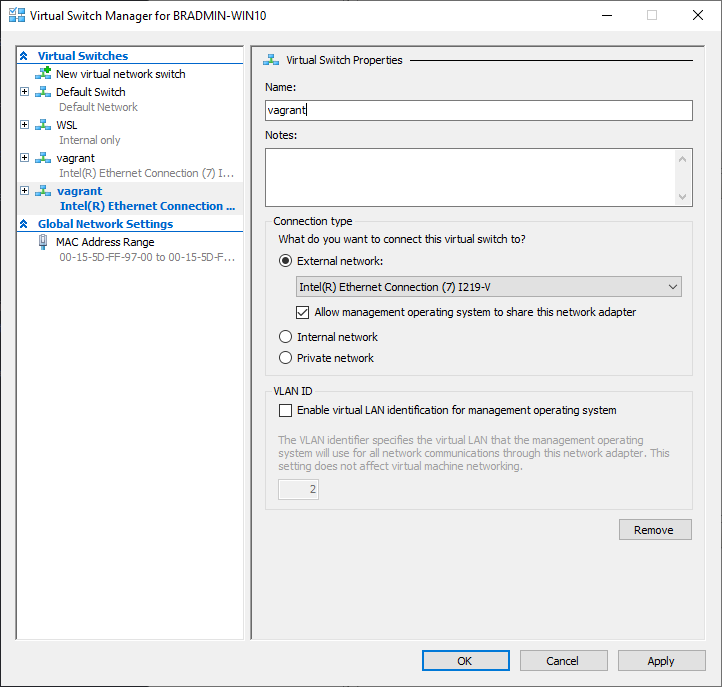 I am naming the v-switch vagrant. Select External Network and choose the desired adapter from the list. Also tick the box to Allow management operating system to share this network adapter.. Then click OK
