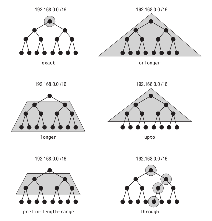 The below diagram[2] illustrates how route filters affect the selection of prefixes in the radix tree.