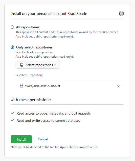 I am enabling the app for Only selected repositories and only for the aws-static-site-tf repo.