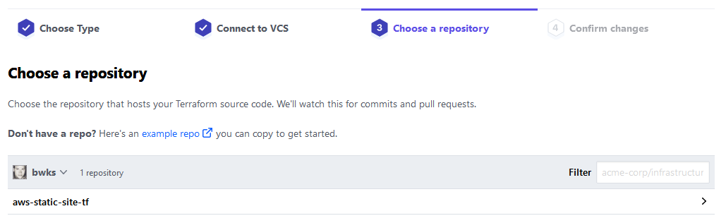 Now, back on Terraform Cloud select the aws-static-site-tf repo to go to the settings page.